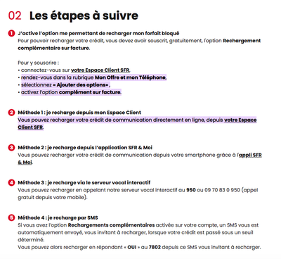 Donc, je te les met ici :le complément de facture existe mais dans le cadre d'un rechargement de forfait bloqué .