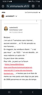 J utilise aussi les groupes facebook pour partager mon experience sfr avec mes voisins dans la vallée ou j habite ( la fibre vient d y etre disponible depuis septembre ) ... Au vue des nombreuses questions que j y recois .le message est bien passé