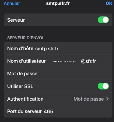 - J'imagine que tu utilises bien le serveur SMTP smtp.sfr.fr (et pas un autre, comme smtp.numericable.fr ou bien smtps.sfr.fr ?)