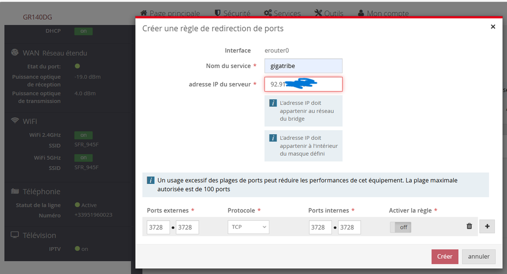 tout d'abord une grand merci pour votre réponse.. J'ai donc bien fait ce que vous m'avez dit rebooter la box et refais un rediction de port. tout va bien jusque la mais sur gigatribe le port est toujours fermé. c'est bien l'adress ipv4 que je dois rentrer?
