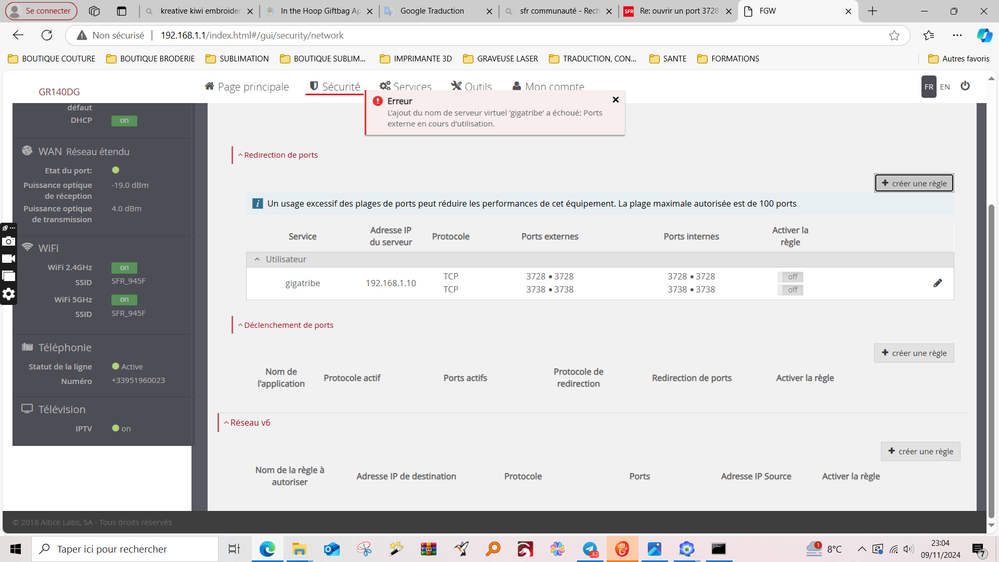 merci pour votre réponse quand je notifie qu'il me dit c'est sur mon routeur . j'avais du me tromper d adresse ip. ca ne change en rien a mon probleme car maintenant quand je rentre le nom du service donc gigatribe il m'est noté ce message : Erreur