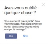 - L’apparition automatique d’une petite fenêtre lors de l’envoi de votre mail vous alertant si vous n’avez pas oublié d’intégrer une pièce-jointe.