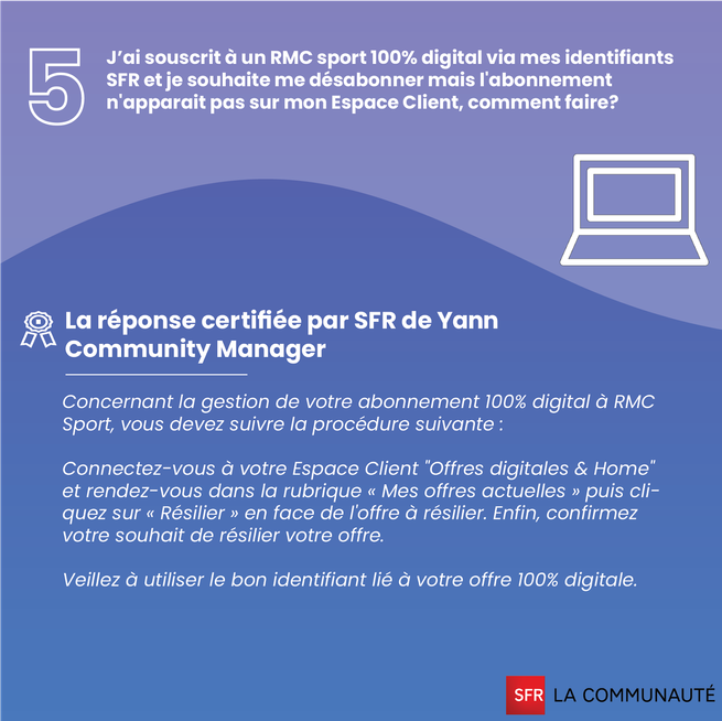 Nous vous donnons rendez-vous le mois prochain pour le nouveau top 5 des meilleures réponses certifiées ! Vous pouvez aussi apparaître dans ce top, pour ce faire rien de plus simple, partagez vos solutions au sein de la Communauté SFR ;)... et n’hésitez bien sûr pas à en chercher d’autres en parcourant cette dernière. Merci à tous les participants de ce mois-ci !
