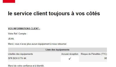 Toutes façons vous allez recevoir un émail de SFR dans 4/5 jours , comme quoi vous n'avez plus d'équipement à retourner.