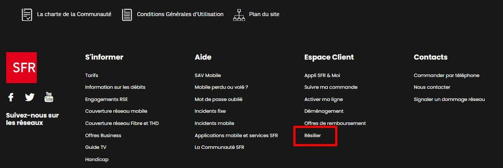 Il est en pied de page, troisième colonne (Espace client) et dernière ligne (Résilier)