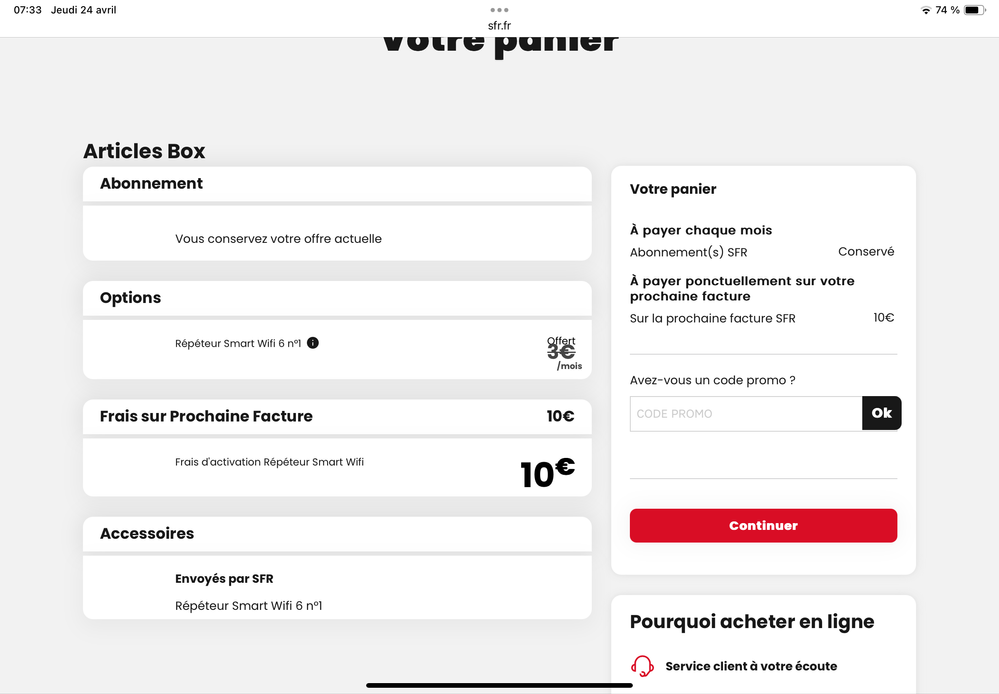il est indiqué que sur simple demande, vous pouvez avoir un répéteur wifi 6 gratuitement. Cool. Je fait la démarche sur l’appli sfr et moi et … on vous demande 10€ de mise en service. Quelle mise en service? Chacun sait qu’il suffit de le brancher et de faire un clic. Encore une fois le sentiment de se faire avoir.