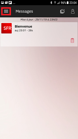 Pour cela, rien de plus simple : Lancez l'application SFR Répondeur+ depuis un autre mobile mais avec VOS identifiants. Ouvrez le menu en cliquant sur l'icône encadré en rouge dans le schéma ci-dessous.