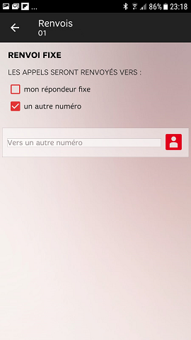 Sélectionnez le renvoi vers votre répondeur ou une autre ligne. Si vous avez choisi le renvoi vers un autre ligne, renseignez le numéro de cette ligne téléphonique. Appuyez sur « VALIDER ».