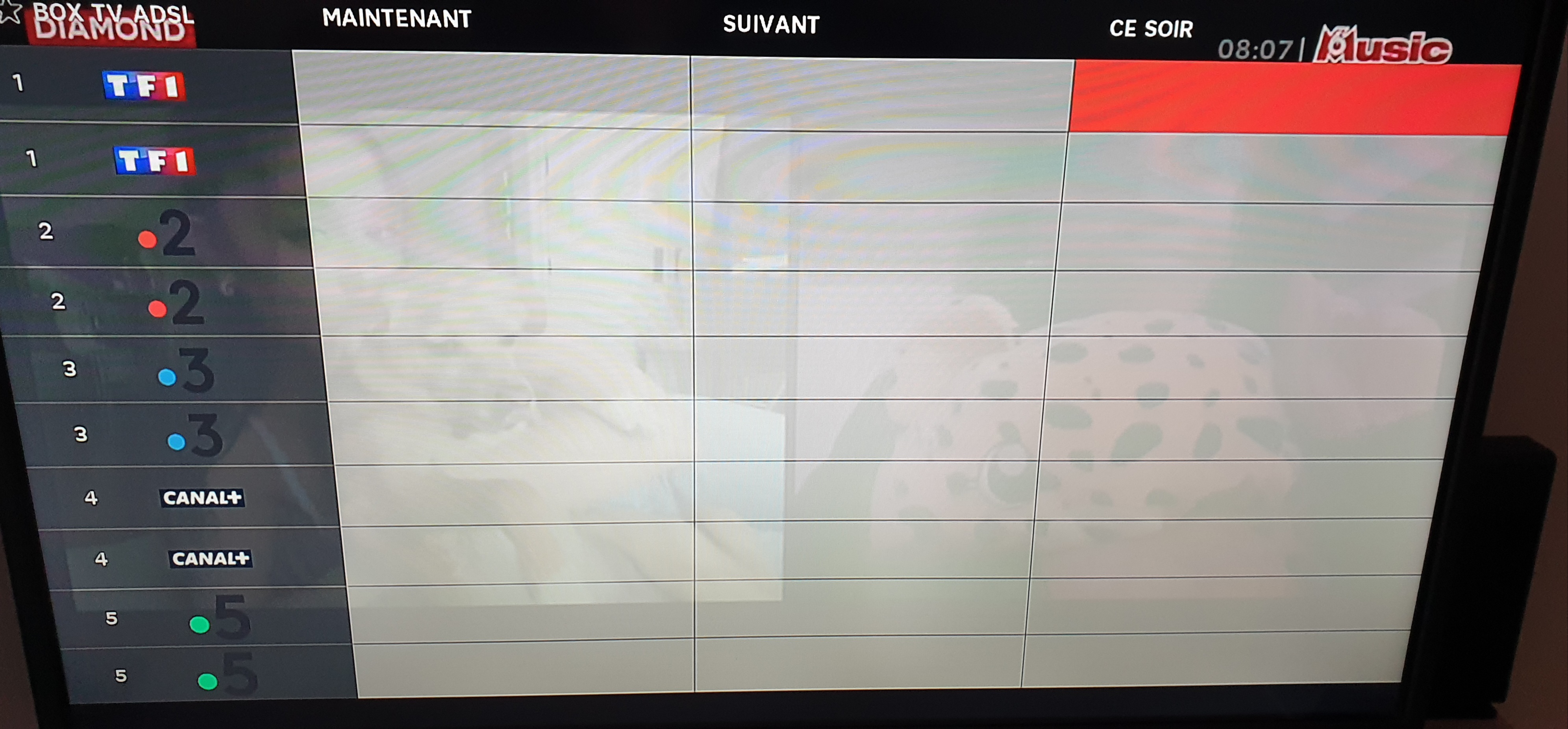 La même opération entre les chaînes 2 et 12 (donc la dernière chaine de ma liste de favoris) n'affiche pas de logo de chaine dans le bandeau mais juste du gris (ce qui peut se comprendre). A partir de cette chaine 12 "grisée" cela part assez facilement en sucette avec des symptomes assez variés. Par exemple, les touches [P-] et [P+] ne fonctionnent plus et font apparaitre un rectangle gris en haut de l'écran. Après quelques autres manipulations, il est également assez fréquent de se retrouver avec un écran noir ou une perte du son même si je n'ai pas encore réussi à reproduire ces comportements de façon fiable.