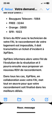 - Bref, ça te dit tout sur la bonne volonté (et la bonne foi) de ce genre de réponse classique (je rappelle souvent sur ce forum que tous ceux qui ont obtenu quelque chose de ce contact pour particulier chez XP FIBRE (ou tout autre OI d'ailleurs) ont généralement dû vraiment être fermes et insistants pour rappeler à un OI ce qui est de sa responsabilité d'OI... Car en effet, leur réflexe n° 1 est de refouler tout particulier (ce qui d'ailleurs est abusif même compte tenu de leurs propres conseils, voire plus bas)