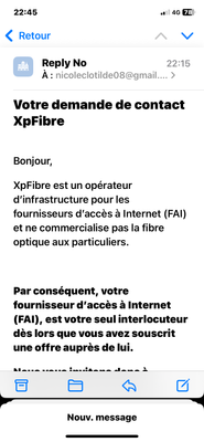 Alors suite à mes recherches XP fibre est anciennement sfr ( je suis chez sfr) … je leur ai envoyé un message et ils me répondent qu’ils ne s’occupent pas des particuliers et de contacter notre fournisseur sfr… le serpent qui se mort la queue 😅 la réponse de sfr : nous devons annuler votre commande et vous devez nous rendre de matériel… nous sommes dans l’incapacité de vous relier au reseau extérieur. Sauf que comme ils ont le monopole sur notre immeuble aucun autre fournisseur ne veut nous prendre. Voilà voilà… et ça fait 3 mois que ça dure. Belle soirée