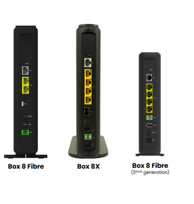 - tandis que la "box 7 fibre" [nom technique NB7] est un modèle récent, sorti après la box 8, remplaçant la Box Plus (avec la même esthétique extérieure, mais ONT intégré)