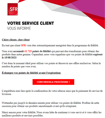 C'est bien une tentative de phishing. Comme dit par @TagadaTsoinTsoin (merci pour ton intervention !) il n'y a plus de points de fidélité chez SFR depuis de nombreuses années. Je vous invite à faire un clic doit sur ce mail puis Signaler ce mail comme indésirable. Ne cliquez sur aucun lien qu'il contient et supprimez-le. N'hésitez pas à lire les nombreuses conversations similaires sur la Communauté, ainsi que cette page de l'Assistance pour vous aider à mieux reconnaître les mails frauduleux :).