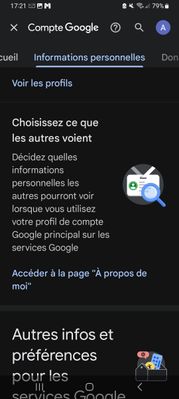 - dans Informations personnelles >A propos de moi : Gérez vos informations personnelles et Contrôlez qui peut les consulter lorsque vous utilisez votre profil de compte Google principal sur les services Google : il y a 2 possibilités : Vous uniquement (petit cadenas) et Tout le monde :