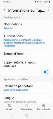- vous me conseillez de : retirer les Autorisations : est-ce au niveau : Informations sur l'application >Autorisations : qu'il faut supprimer ? : j'ai : Appareil photo, Contacts, Journaux d'appels, Microphone, Notifications et Téléphone : que faut-il supporter dans ma situation ?