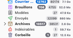 • (voir capture ci-dessous) plus de 80 000 mails dans boite de "Réception" principale (ce qui fait qu'elle occupe 7 Go d'un coup sans broncher pour le "Inbox"), 30 000 mails "Envoyés", et plusieurs dizaines de milliers archivés dans des dossiers