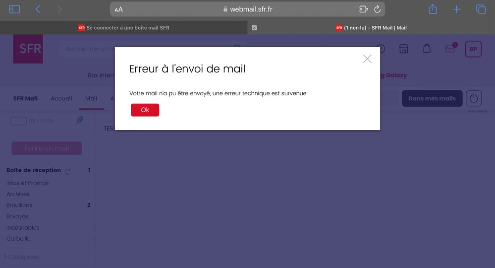 voici une capture d’écran faite à l’instant. Il m’est imposssible d’envoyer un mail ni d’en recevoir sur ma boite mail SFr qui pourtant en comporte des anciens de 2021 et est la seule messagerie associée à mon compte client..