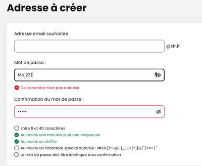 Actuellement, lors d’une création d’une nouvelle boîte mail SFR via l'Espace Client, la plupart des caractères spéciaux (a inclure dans le mot de passe), faisant partie de la liste des caractères à priori acceptés, sont rejetés. Seuls quelques-uns sont acceptés. Par contre, ces caractères rejetés sont acceptés lors de la modification d’un mot de passe d’une boîte mail existante.