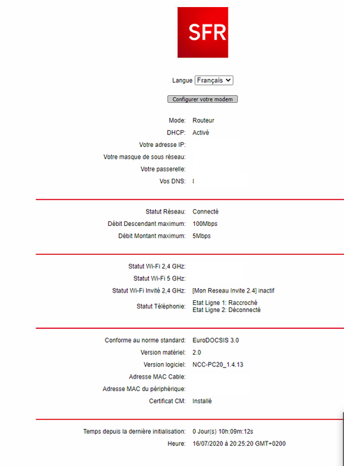 Ma box est en version EURODOCSIS 3.0, version materiel : 2.0 et firmware : NCC-PC20_1.4.13