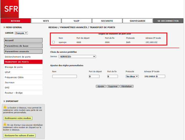Impossible d'utiliser la fonction transfert de port et d'accèder a mon raspberry depuis l'exterieur, voir screenshot ci apres.